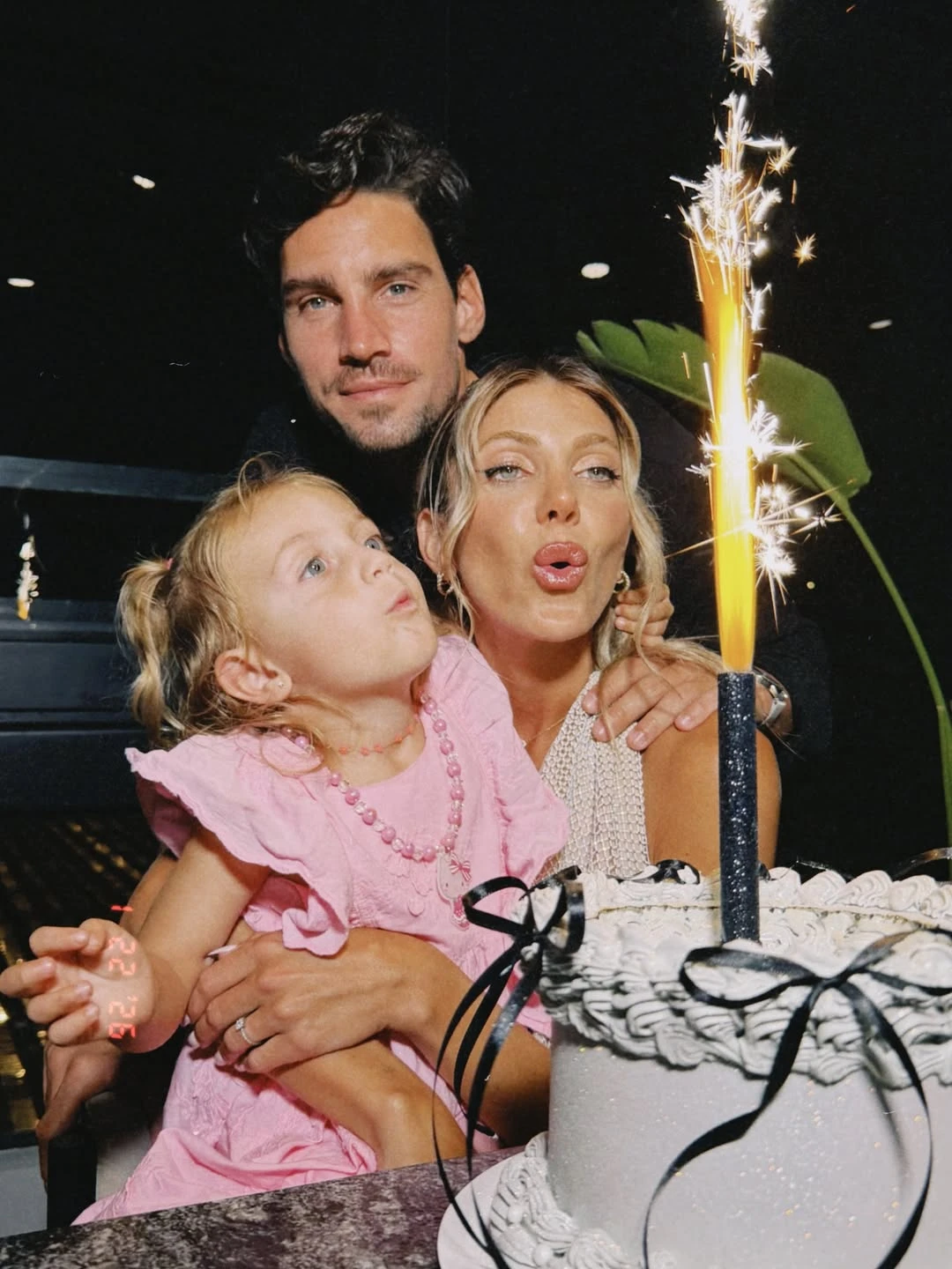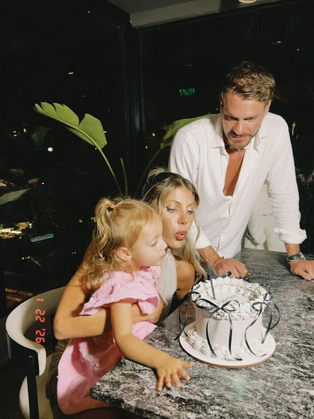 El clima del lugar acompaña la vibra íntima: una mesa de piedra gris, grandes ventanales que asoman a la noche y hojas de plantas tropicales enmarcando las fotos. En otra postal, se los ve reunidos para cantar el feliz cumpleaños: él con camisa blanca arremangada y ella sentando en su falda a Vita, que luce un vestido rosa con volados y collar de cuentas. Hay abrazos, sonrisas y un chispazo dorado que enciende la escena como fuegos artificiales de sobremesa.