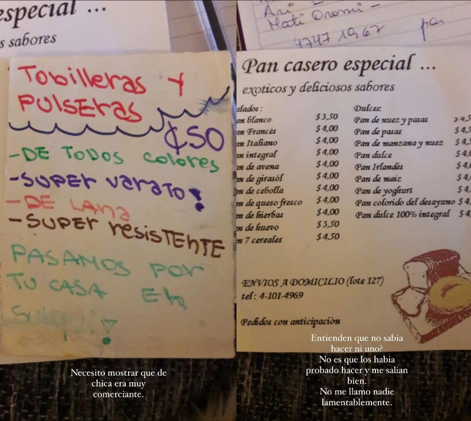 Desde su cuenta de Instagram, Lelé mostró primeramente dos imágenes de carteles que utilizaban para venta, como si fuese un mini emprendimiento: “Tobilleras y pulseras, 50 centavos. De todos los colores, super barato, de lana, super resistente. Pasamos por tu casa”, rezaba uno de los carteles, a lo que la hija del conductor dijo: “Necesito mostrar que de chica era muy comerciante”.