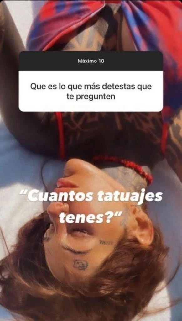 Otra de las preguntas tuvo que ver con la cantidad de dibujos que lleva en su piel: “¿Qué es lo que más detestas que te pregunten?”, le consultaron y, sin vueltas, respondió: “¿Cuántos tatuajes tenés’”. Sus tatuajes son tan llamativos que resulta entendible que siempre quieran saber el número de diseños que tiene, sin embargo, en alguna oportunidad aseguró que ya no lleva la cuenta.