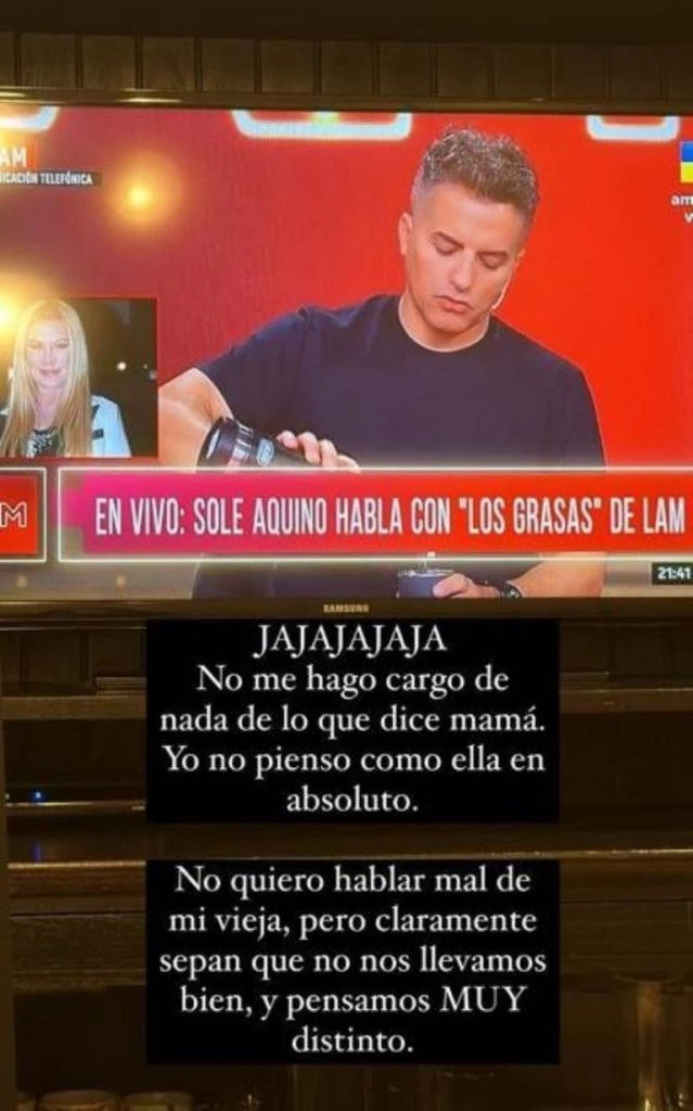 Aquino trató como "grasa" al ciclo conducido por Ángel de Brito y ayer en el show televisivo de América TV trataron el tema. Cande, que lo estaba viendo, dio su punto de vista y allí dejó en claro cómo es su relación con su madre. “Ja,ja,ja. No me hago cargo de nada de lo que dice mi mamá. Yo no pienso como ella”.