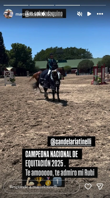 Marcelo, conmovido, le dedicó un emotivo mensaje: “Hoy sos CAMPEONA NACIONAL DE EQUITACIÓN. SIIIII. Lo lograste mi amor. Estoy orgulloso de vos, te admiro… Fue una mañana hermosa que disfrutamos junto a tu vieja… y tu yegua, Caruscha, vuela literalmente”. La respuesta de Cande no tardó en llegar: “Qué lindo posteo, pa. Te amo… Un día inesperado y especial para mí teniéndolos a ambos juntos mirándome y bancándome”.