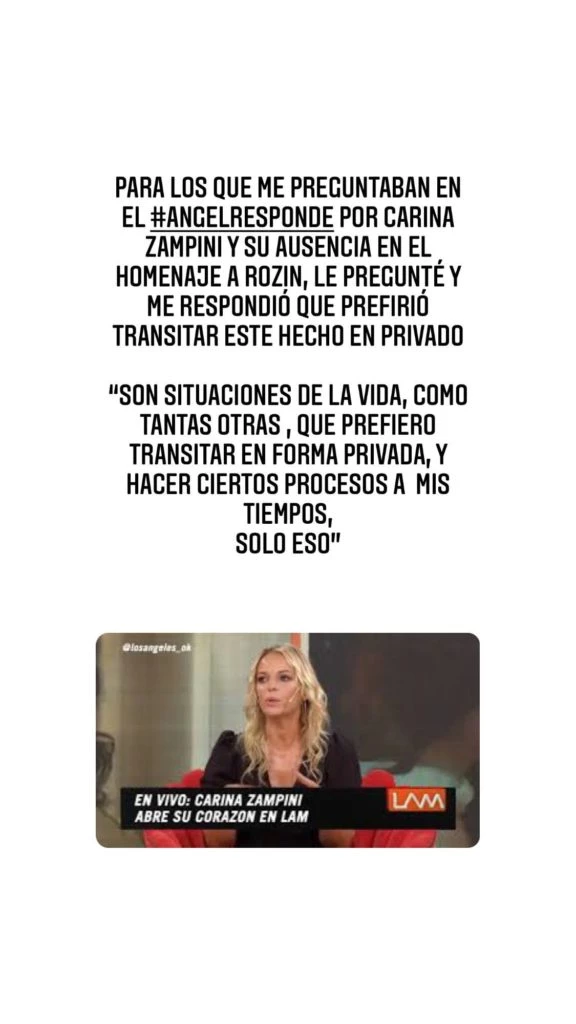 Fue entonces que Ángel de Brito reveló el por qué. A través de sus historias de Instagram compartió el motivo por el que la conductora no participó el domingo pasado del homenaje a Gerardo Rozín en Telefe, "Para los que me preguntaban en el #AngelResponde por Carina Zampini y su ausencia en el homenaje a Rozín, le pregunté y me respondió que prefirió transitar este hecho en privado".