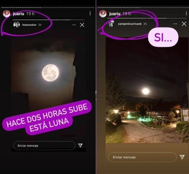 La joven, experta en buscar cuestiones casi imperceptibles en las redes, se topó con algo que le llamó la atención: “Hace dos horas sube esta luna”, dijo, haciendo referencia a Federico. Pegada al lado subió una postal de Zampini, también con la luna como referente, que pareciera haber sido tomada desde el mismo lugar.