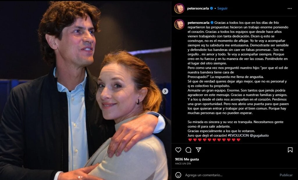 "Yo te voy a acompañar siempre. Demostraste ser sensible y defendiste tus banderas sin caer en falsas promesas, sos mi orgullo, mi amor y todo", compartió Carla y completó: "Sé que de verdad querés dejar algo mejor, que no es personal sino colectivo tu propósito", escribió Peterson.
