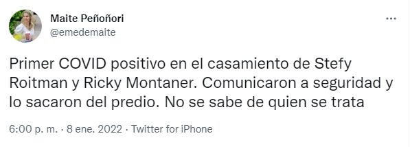 "La mejor amiga de la esposa de Montaner dio positivo en Covid en el casamiento de Stefi y Ricky", escribió el periodista en Twitter.