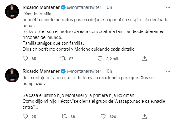 “Se casa el último hijo Montaner y la primera hija Roidman. Como dijo mi hijo Héctor: ‘Se cierra el grupo de Whatsapp, nadie sale, nadie entra’”, agregó. Con este mensaje hizo una clara referencia a que todos sus hijos ya están casados por lo que todos pueden permanecer en el grupo de WhatsApp.