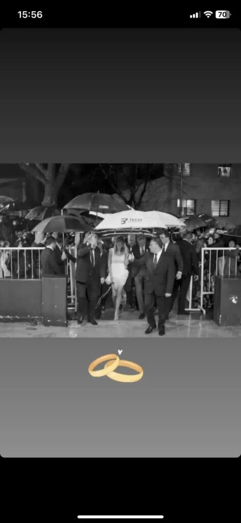 Luego, la exconductora de El gran premio de la cocina versión famosos recordó la jornada lluviosa. Paula compartió una foto de su ingreso junto a Pedro Alfonso al salón ubicado en el Tigre con varios paraguas cubriéndole la cabeza. Debajo de la fotografía, subió un emoji de dos anillos de casados.