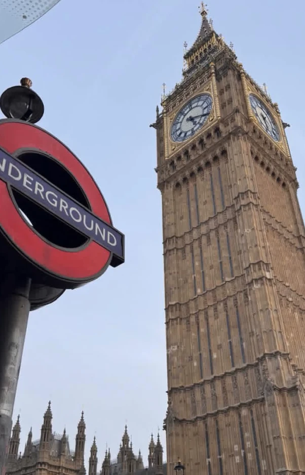 El recorrido continuó por los clásicos de la ciudad. Frente al Big Ben y el Palacio de Westminster, la familia volvió a posar con el atardecer cayendo sobre Londres, generando una de las fotos más cálidas del viaje.