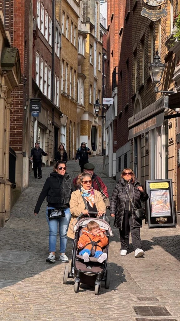 Las historias de Instagram también mostraron escenas cotidianas del paseo: caminatas por calles adoquinadas con edificios históricos, una parada frente a un típico pub londinense de fachada azul intensa y detalles arquitectónicos, y hasta una salida familiar más amplia, donde se vio a los abuelos disfrutando del viaje junto a sus nietos.