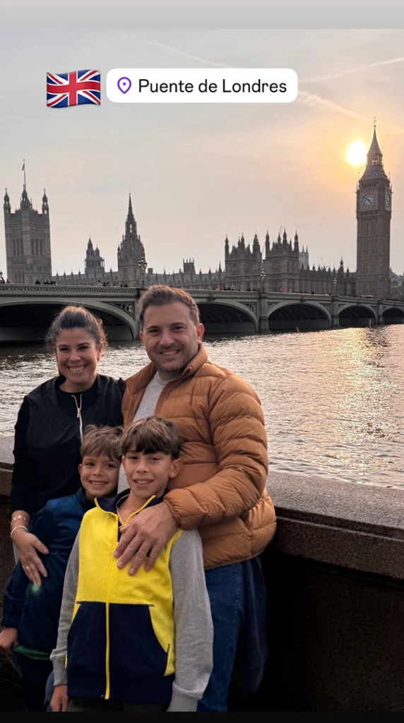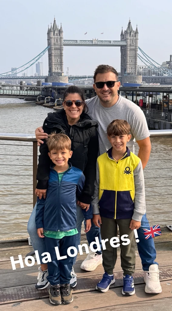 La primera postal que compartió en sus redes mostró a toda la familia posando sonriente frente al icónico Tower Bridge. Con looks cómodos y relajados, Cecilia y Brancatelli abrazaron a sus hijos mientras el río Támesis y el puente de fondo completaron una imagen de postal.