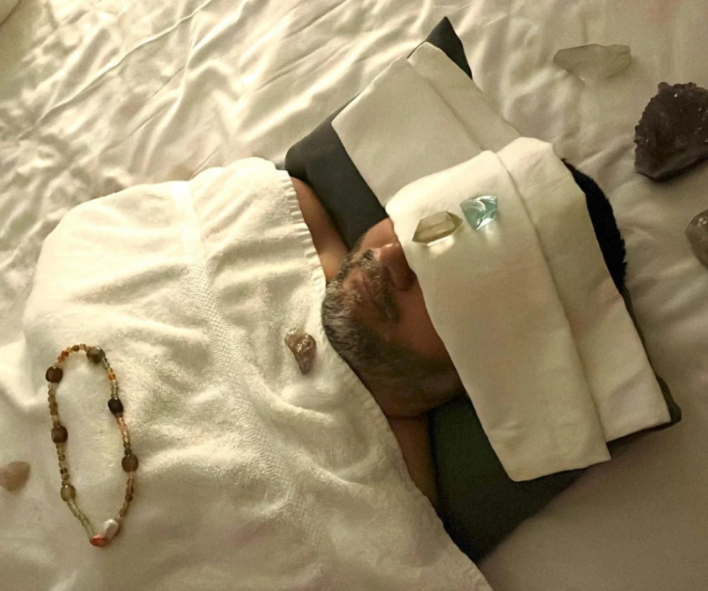 Pero hubo una línea de su extenso texto que se llevó toda la atención: "Gracias a mí paciente favorito que es el que más disfruta de mis terapias", cerró y publicó una imagen del músico acostado en sábanas blancas con piedras en su rostro.