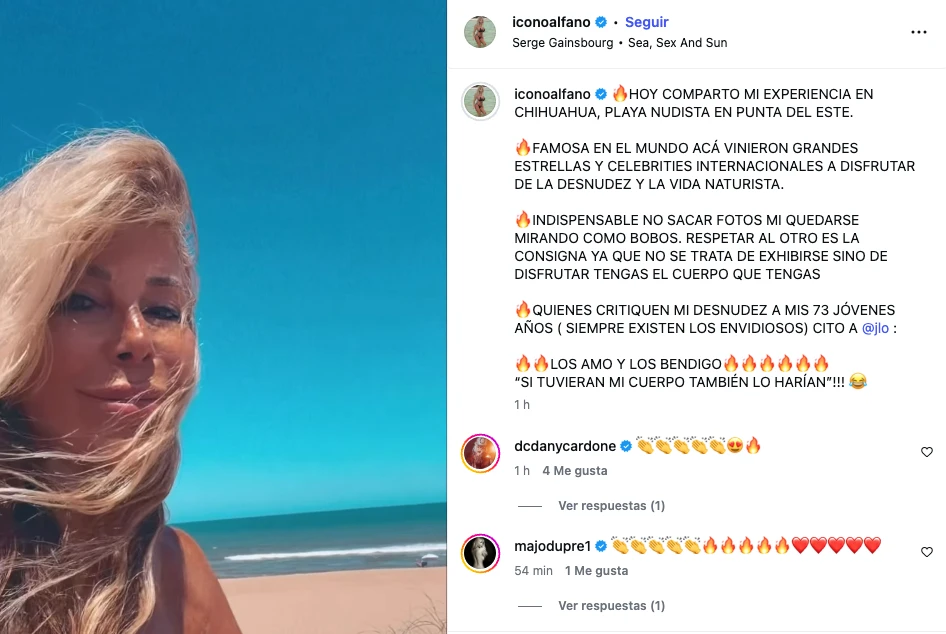 Pero las imágenes no llegaron solas. La actriz acompañó el video con un extenso texto donde, antes que nada, se encargó de educar a sus seguidores sobre cómo debe ser el comportamiento en este tipo de lugares. "Hoy comparto mi experiencia en Chihuahua, playa nudista en Punta del Este", relató, para luego destacar que es un destino famoso en el mundo donde han ido "grandes estrellas y celebrities internacionales a disfrutar de la desnudez y la vida naturista".