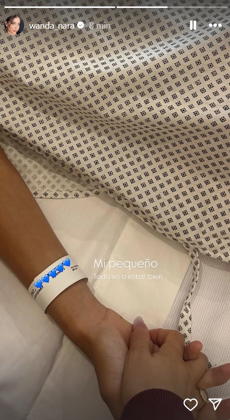 "Mi pequeño, todo va a estar bien", escribió Wanda sobre la foto de su mano agarrando a la de su hijo, que estaba acostado en una camilla. A pesar de que la imagen la subió a sus redes sociales, no aclaró por qué motivo estaba internado uno de sus hijos, ni dónde se encontrba.