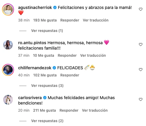 A su vez, algunas figuras del mundo del espectáculo le escribieron unas palabras, como es el caso de Georgina Barbarossa, que le puso "Felicidades", junto a emojis de corazones y aplausos. Agustina Cherri le comentó: "¡Felicitaciones y abrazos para la mamá!".