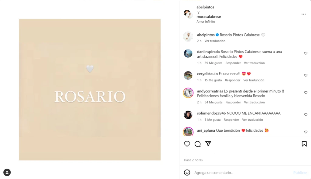 Este miércoles, con la misma modalidad de posteo compartido en el feed, el cantante y su esposa publicaron una imagen en su Instagram en la anunciaron que están a la espera de una hija que se llamará Rosario y tendrá doble apellido: Pintos Calabrese.