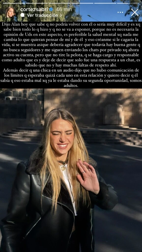 Frente a los dichos de su expareja, Sabrina decidió hacer un descargo en sus historias de Instagram. "Dijo Alan hoy que sabe que no podría volver con él o sería muy difícil. Es porque sabe bien todo lo que hizo y que no se va a exponer, porque no es necesaria la opinión de ustedes en este aspecto", comenzó escribiendo.