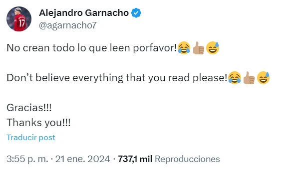 De manera escueta pero contundente, Alejandro Garnacho utilizó su cuenta X (ex Twitter) y marcó la cancha en medio de la ola de especulaciones.