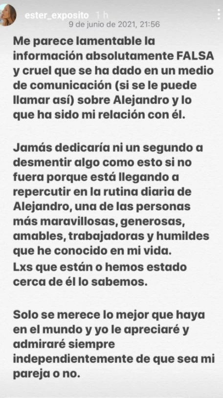 Más adelante, Ester lo describió como “una de las personas más maravillosas, generosas, amables, trabajadoras y humildes que he conocido en mi vida”. “Solo se merece lo mejor que haya en el mundo y yo lo apreciaré y admiraré siempre, independientemente de que sea mi pareja o no”, agregó la joven de 21 años.