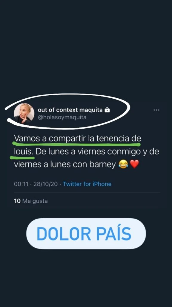 Luego compartió los mensajes de Twitter de la ¿ex? novia de Alex Caniggia, que tiene su perfil privado: "Me hace bien haber cortado tan bien, pero me hace verg# saber que va a sufrir por mi culpa".