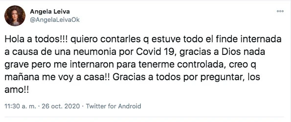 "Hola a todos!!! quiero contarles q estuve todo el finde internada a causa de una neumonia por Covid 19, gracias a Dios nada grave pero me internaron para tenerme controlada, creo q mañana me voy a casa!! Gracias a todos por preguntar, los amo!!", escribió junto a una foto de ella en el sanatorio.