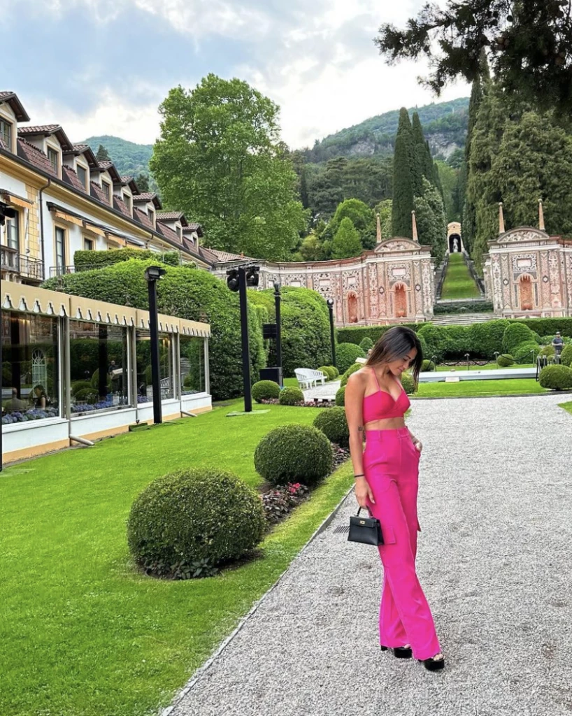 Ahora, Roccuzzo lució un nuevo outfit de estilo Barbiecore, integrado por un pantalón cargo -una tendencia de los años 2000 que vuelve con fuerza este año- y un sensual top bralette, prendas que combinó con sandalias con plataformas y una minibag Kelly de Hermes.