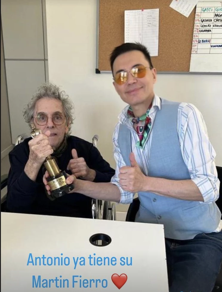 Este miércoles, Marcelo Polino sorprendió a todos al compartir una fotografía junto al icónico actor, quien no se mostraba en redes desde hace tiempo. En la imagen aparecen los amigos sonriendo con el galardón en sus manos, se lo ve a Gasalla en sillas de ruedas.