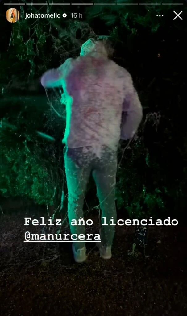 "¡Se recibió Manu Urcera!", escribió Nicole junto a un video en la que se la ve bailando junto a su marido mientras el resto de sus amigos lo sorprenden con espuma.