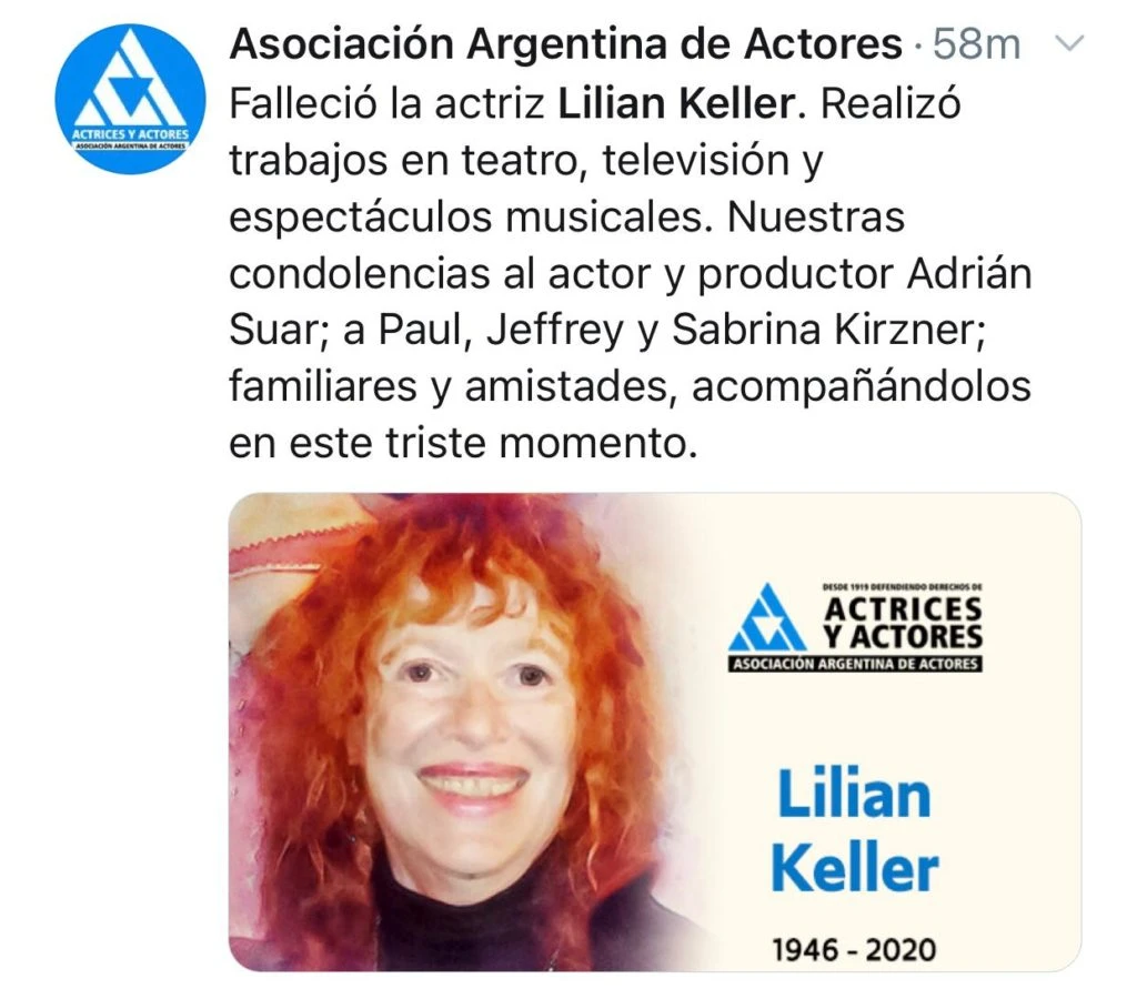 Tal como comunicó la Asociación Argentina de Actores, falleció hoy a los 74 años Lilian Keller, madre de Adrián Suar (52).
