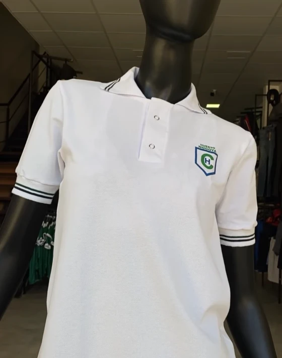 La identidad visual del colegio es inconfundible. Las alumnas llevan un pantalón azul combinado con una chomba blanca con doble franja azul en el cuello y en las mangas. El escudo -en azul y verde- va al frente, justo al lado del corazón.