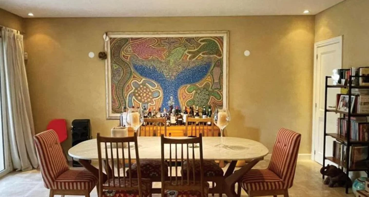 El sector del comedor se distingue con una mesa de tapa de mármol blanco y base de estilo americano. Cuenta con una gran barra para realizar tragos y una enorme pieza de arte que emula el mundo marino.