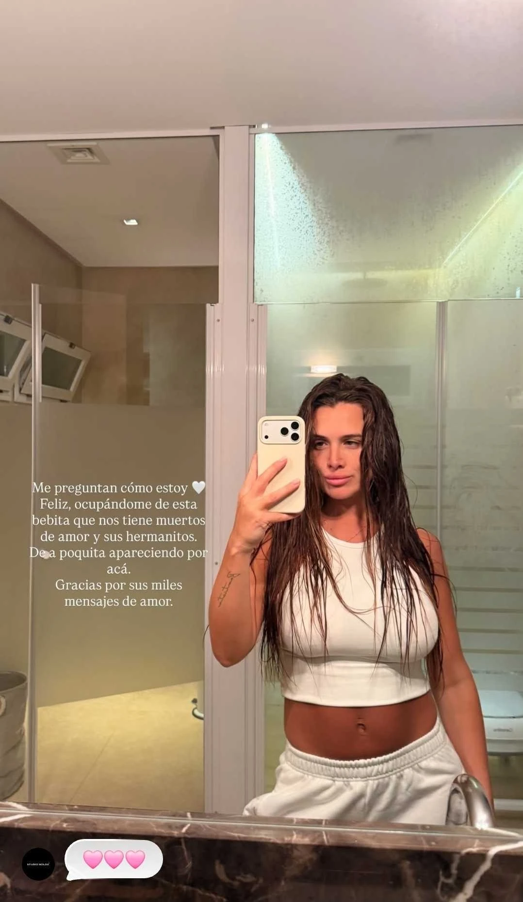 “Feliz, ocupándome de esta bebita que nos tiene muertos de amor y sus hermanitos”, explicó. Y agregó: “De a poquito apareciendo por acá. Gracias por sus miles mensajes de amor”.