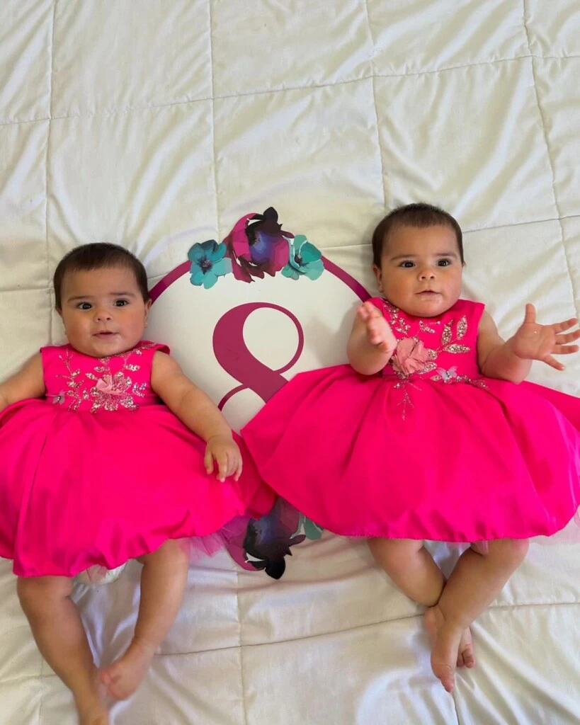 Aunque cueste creerlo, ya pasaron 8 meses del nacimiento de Aimé y Laia, las gemelas de Daniela Celis y Thiago Medina, y como era de esperarse, pues así sucede desde su llegada a este mundo, los flamantes papás primerizos organizaron un tierno festejo por este nuevo cumplemes.
