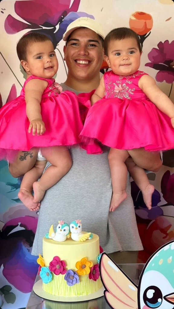 El ex concursante de Gran Hermano, famoso por su difícil historia de vida en González Catán, partido de La Matanza, posó con sus hijas (una de ella en cada uno de sus brazos) y sobre esa emotiva postal escribió: "8 meses cumplen mis bebés hermosas".