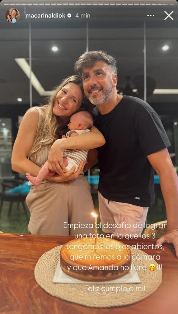 Al finalizar el día de cumpleaños, el martes por la mañana, Macarena compartió una tierna postal familiar, de su festejo de cumpleaños. "Empieza el desafío de lograr una foto en la que los 3 tengamos los ojos abiertos, que miremos a cámara y que Amanda no llore", bromeó la bailarina.