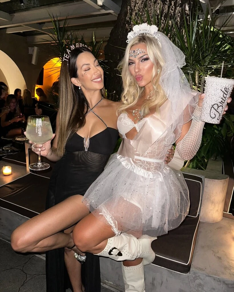 Para esta ocasión, Bechara lució un sexy vestido simil casamiento con transparencias y tules brillantes. Además sumó una serie de brillos en su frente, botas blancas de caña larga y llevó un vaso con brillos con la inscripción en inglés Bride (novia).
