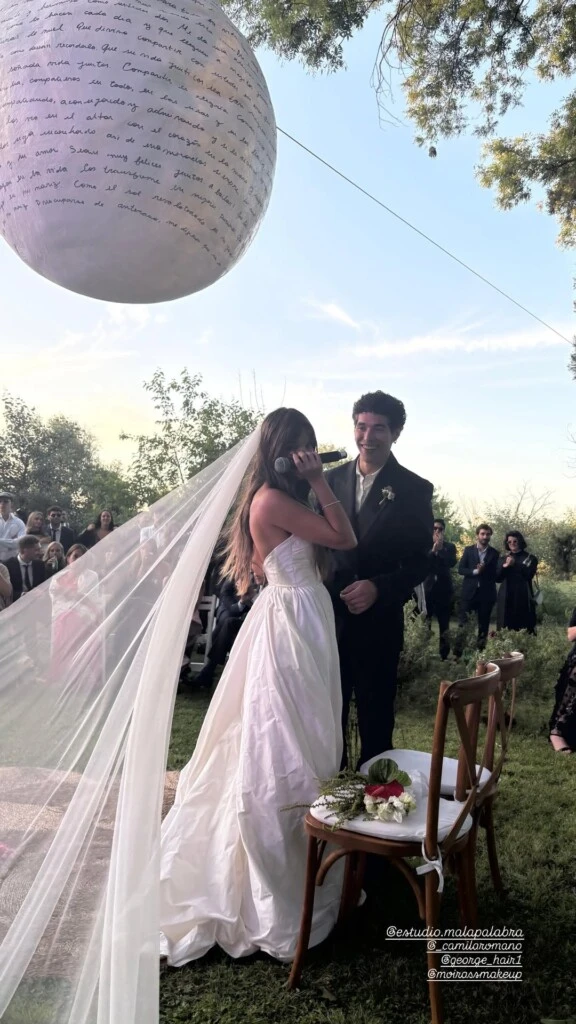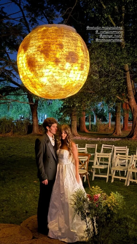 La ceremonia se llevó adelante en un entorno natural donde predominaban el verde, los árboles y una enorme esfera blanca suspendida sobre los novios, intervenida con manuscritos que funcionaron como una pieza decorativa central y cargada de simbolismo.