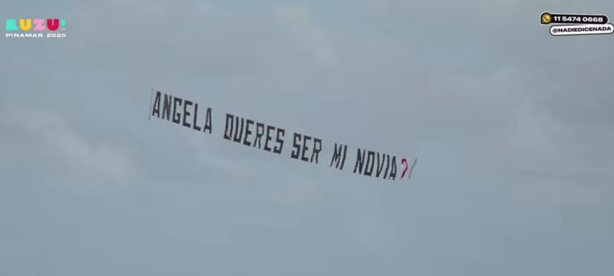 “No lo voy a decir yo, está ahí”, lanzó Giles, señalando el cielo. Segundos después, una avioneta sobrevoló la costa con un mensaje imposible de ignorar: “Ángela, ¿querés ser mi novia?”.