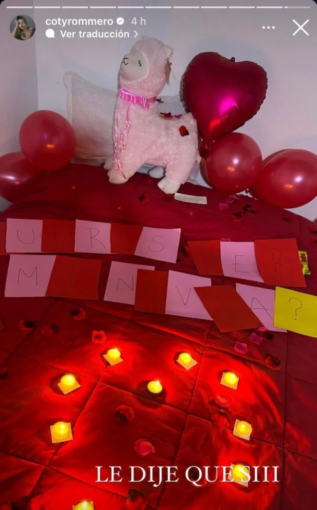 A su vez, llenó la cama de pétalos de rosas, puso unos globos rojos y uno de un corazón, y armó un corazón con velitas. En la cama, la exjugadora de Gran Hermano tenía un animal de peluche, que estaba en el medio de los globos. Al compartir esta historia con sus seguidores, Coty confirmó su respuesta: "Le dije que sí".