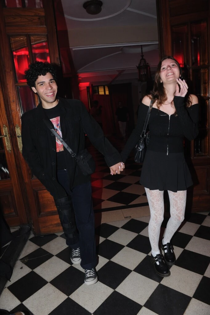 La hija de Fito Páez lució medias de encaje blanco, zapatos negros con hebillas, minifalda y una campera ajustada negra. Por su parte, el joven la acompañó en jeans, zapatillas, remera y campera negra también.