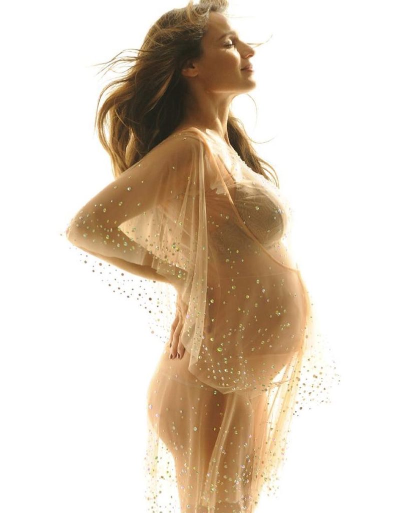 En las mismas se la puede ver posando feliz con su pancita de embarazada bajo una luz cálida, que marca su espléndida figura y deja ver su vestido con trasparencias color nude y con toques de pedrería.
