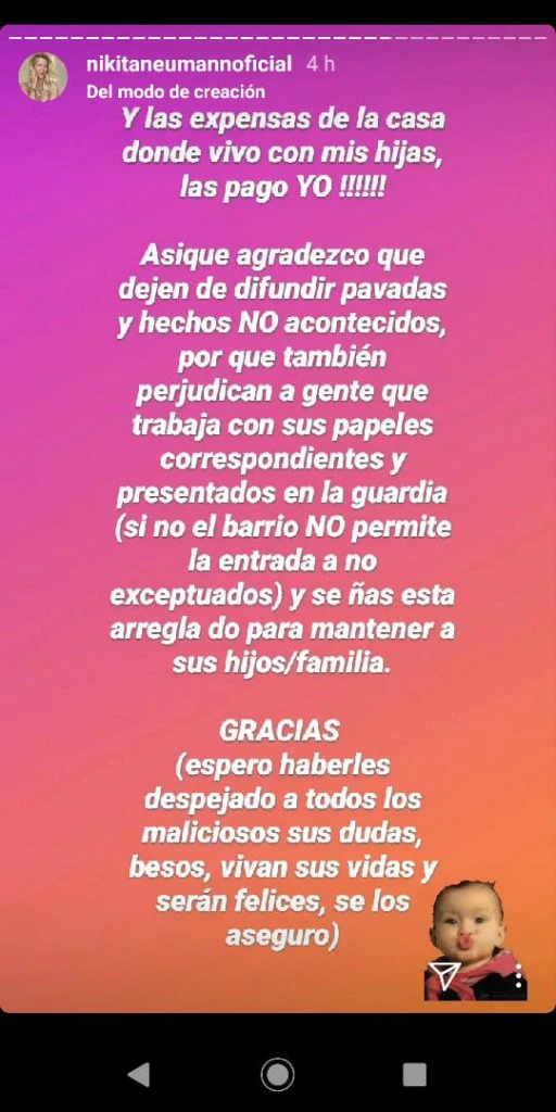 En diálogo con Nosotros a la mañana, donde ella es panelista, Nicole aclaró que no tiene ninguna multa, que en el barrio solo pueden entrar personas con permiso para circular y que su manicura ahora vende comida debido a la situación por coronavirus.