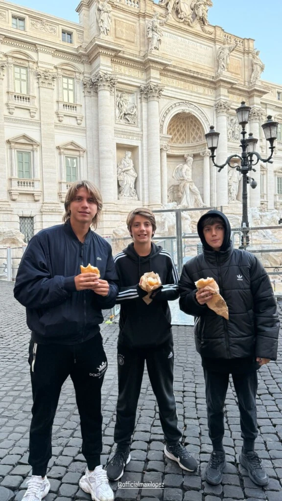 Otra de las imágenes que compartió Wanda de sus tres hijos recorriendo Roma fue en la Fontana de Trevi, donde frenaron a comer algo y los chicos posaron contentos. En esta historia, la influencer etiquetó a Maxi, quien la compartió en sus redes sociales, afirmando: "Vamos muchachos, que papá los está esperando".