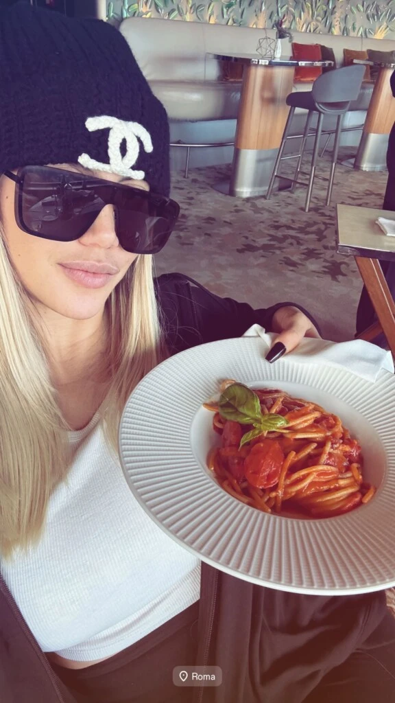 En una de las historias, la conductora de Telefe posó junto a un plato de pastas, típico de Italia. Por lo que se puede ver en la imagen, está sentada en un restaurante, con un look canchero, que lo complementó con un gorrito de lana de Chanel, junto a unos anteojos de sol bien grandes y negros.