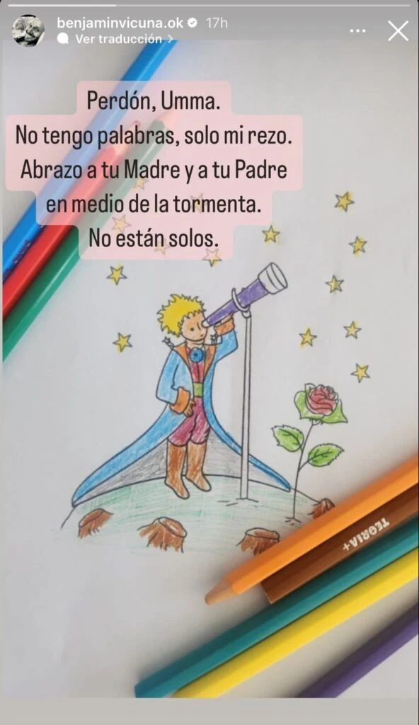 "Perdón, Umma. No tengo palabras, solo mi rezo. Abrazo a tu madre y a tu padre en medio de la tormenta. No están solos”, escribió Vicuña desde sus redes sociales junto aun dibulo de El Principito.