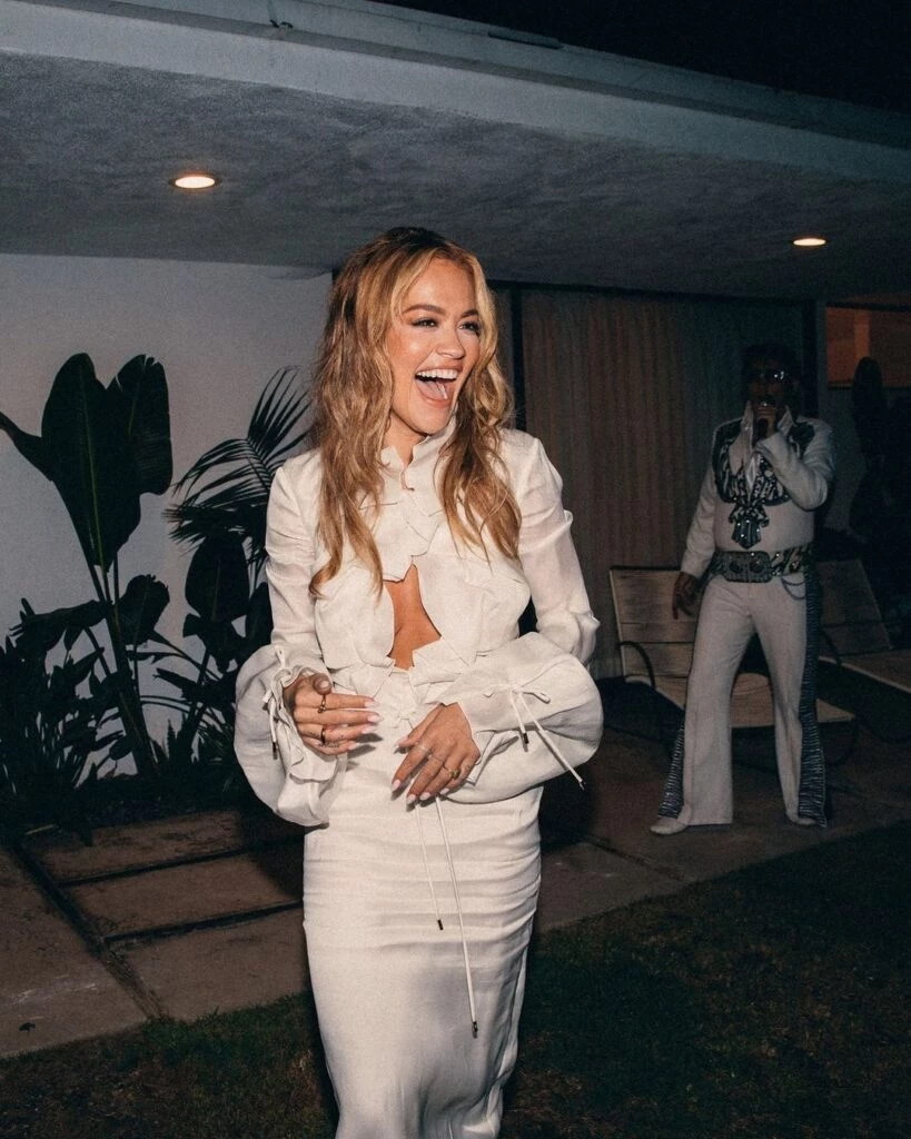 "Es diferente porque la estabilidad está ahí, el marco; es como una obra en construcción, es como si todo se hubiera construido ahora, así que... Me la pasé bien en mi vida; ahora estoy emocionada por pasar a la siguiente etapa de mi vida. Estoy feliz de descubrir el siguiente capítulo de cosas que no había hecho: no me había casado, no había sentado la cabeza... hasta ahora", confesó Rita Ora, sobre el gran paso personal que dio.
