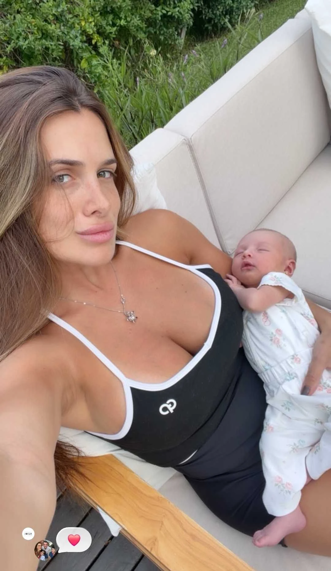 En la postal, Cami apareció recostada en un sillón de exterior, con vegetación verde de fondo, en un clima relajado y hogareño. Con un look deportivo —un top negro con vivos blancos— y sin producción evidente, se mostró serena mientras sostenía a su hija piel con piel. Aitana, dormida sobre su pecho, lució un delicado enterito claro con estampado floral y pequeños aritos en sus orejas.