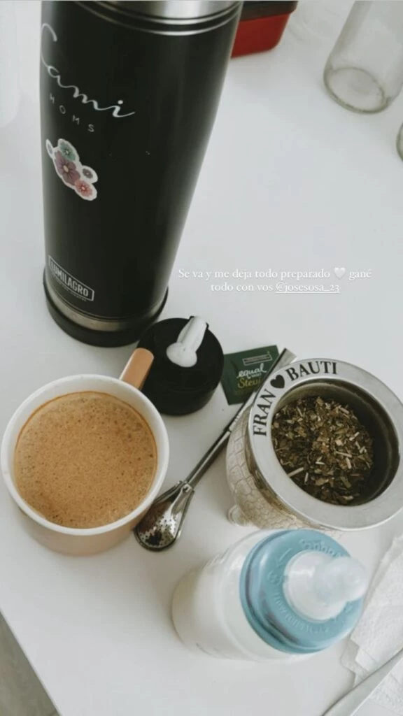 "Se va y me deja todo preparado. Gané todo con vos", escribió la figura de Multitalent y arrobó a su amor. En la foto se ve su termo personalizado, el mate listo, un sobre de edulcorante, un café y una mamadera: todo esperando sobre la mesa mientras Camila arrancaba su día.