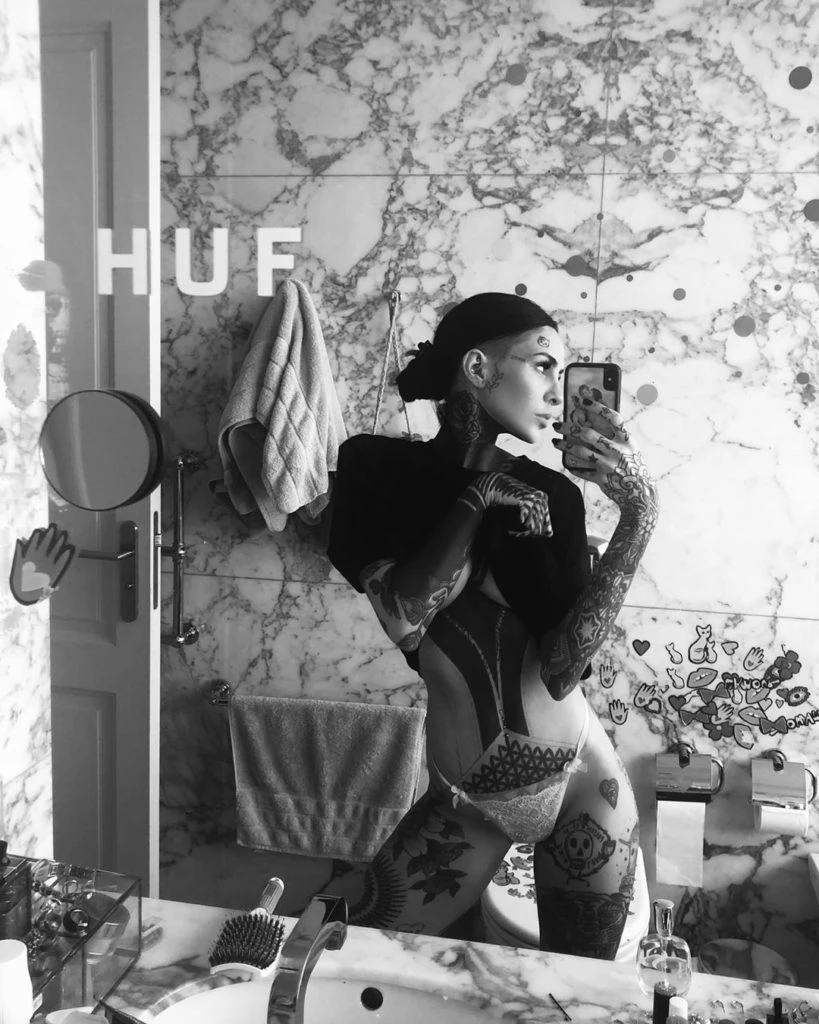 Luciendo un conjunto negro traslúcido de una marca que se define como "lencería de diseño fina y erótica", la intérprete de Yo, Haters y Todo lo que soy se tomó una selfie frente al espejo (utilizando un celular con una funda de Hello Kitty) y escribió un mensaje feminista y desafiante: "Y si los pibes se muestran en zunga y en cuero... No nos jodan. 2020".