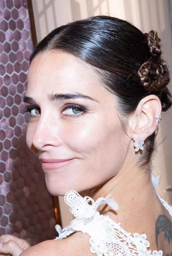 El estilo se completa con un peinado recogido bajo cuatro tenazas simulando un tocado, a cargo de Cristian Mauricio, más el maquillaje a cargo de Mauricio Catarain, con tonos cobre y marrones en ojos en diferentes intensidades.