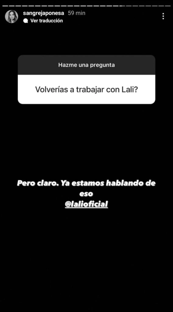 Por último, una de sus respuestas más sorpresivas tiene que ver con Lali Espósito. "¿Volverías a trabajar con Lali?". A lo que ella contestó segura: "Pero claro, ya estamos hablando de eso". Una story que Espósito reposteó y agregó tres emojis: una carita sonriente, un corazón y tres puntos suspensivos.